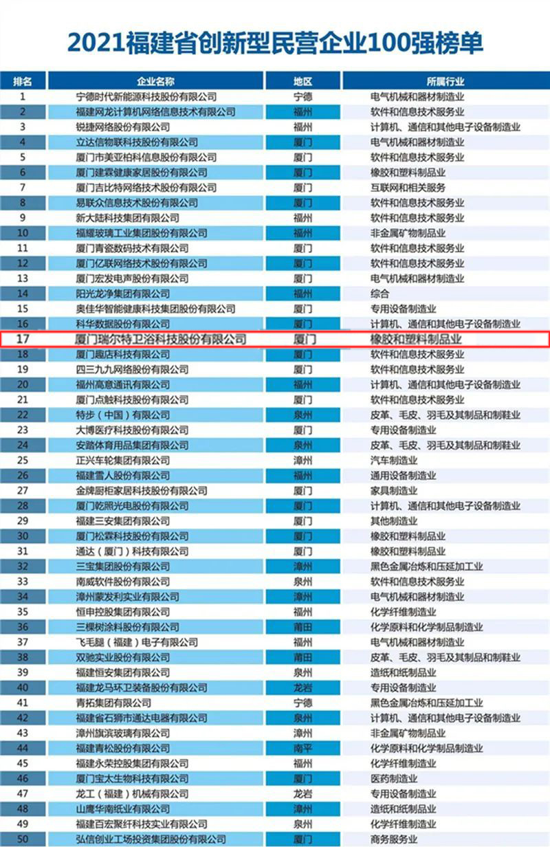 近日,福建省工商業(yè)聯(lián)合會(huì)首次發(fā)布2021福建省創(chuàng)新型民營(yíng)企業(yè)100強(qiáng)榜單,廈門瑞爾特衛(wèi)浴科技股份有限公司憑借創(chuàng)新優(yōu)勢(shì)強(qiáng)勢(shì)上榜,位列第17位。